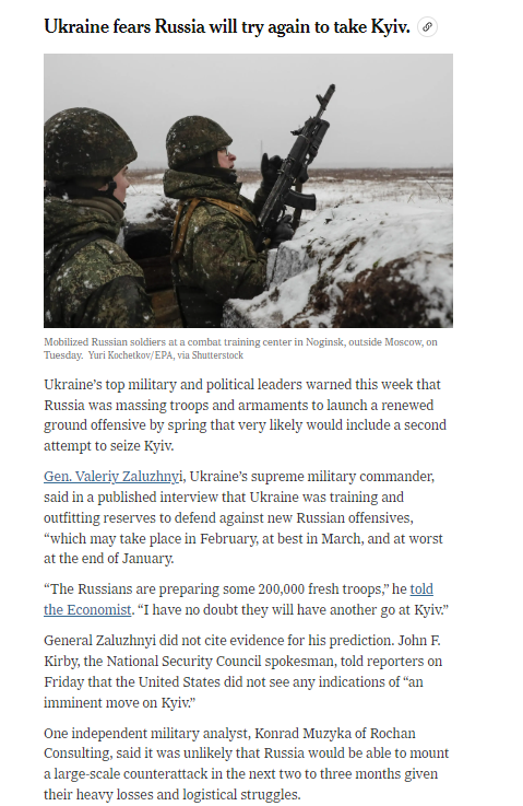 По его мнению, маловероятно, что Россия сможет провести крупномасштабную контратаку в ближайшие два-три месяца, учитывая ее тяжелые потери, нынешние неудачи в подготовке солдат к зимним боям, а также продолжающиеся логистические и организационные трудности.
