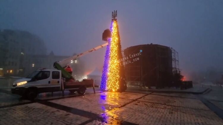 Ель искусственная, 12 метров в высоту - это в три раза ниже, чем в предыдущие годы. На ее верхушке установлен трезубец вместо традиционной звезды, а на ветки развесили елочные игрушки - желтые и синие шары, которые образуют флаг Украины.