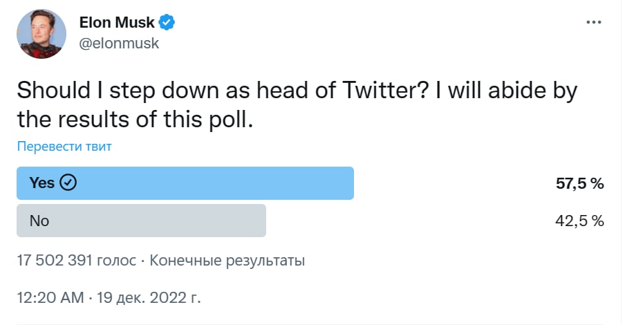 "Должен ли я уйти с поста главы Twitter? Буду придерживаться результатов этого опроса", - написал Маск.