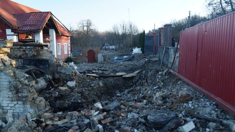 "Шахид" упал прямо во двор, повредив окна, двери и крышу здания. Полностью сгорела летняя кухня, гараж и автомобиль. Взрывной волной также повреждено здание напротив.