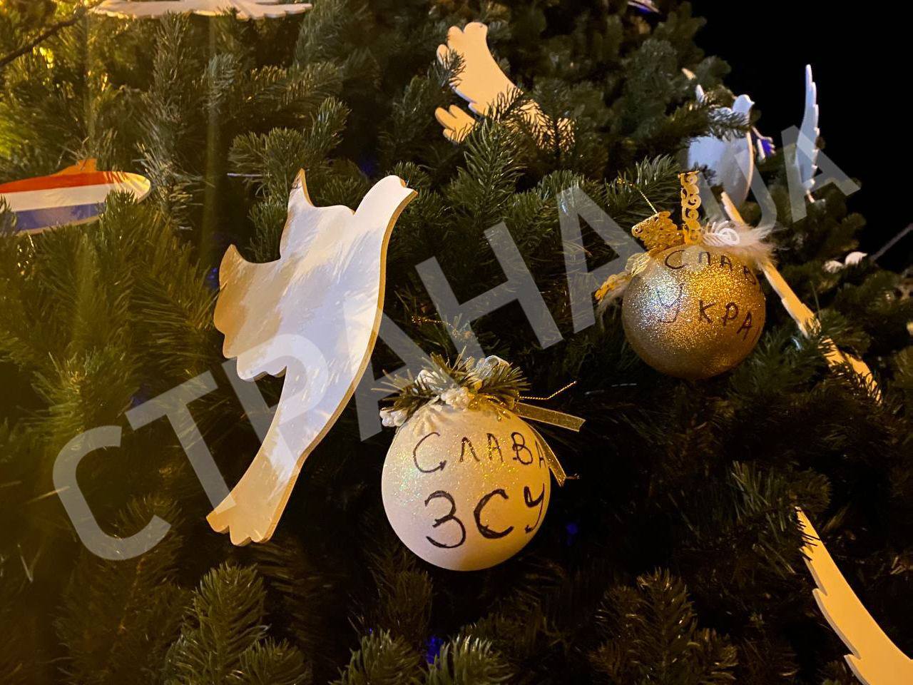 На новогоднем дереве развесили фигурки белых голубей и шары с флагами стран, которые помогают Украине в войне. Возле елке установлена фигура ангела-хранителя. Венчает дерево не традиционная звезда, а трезубец.