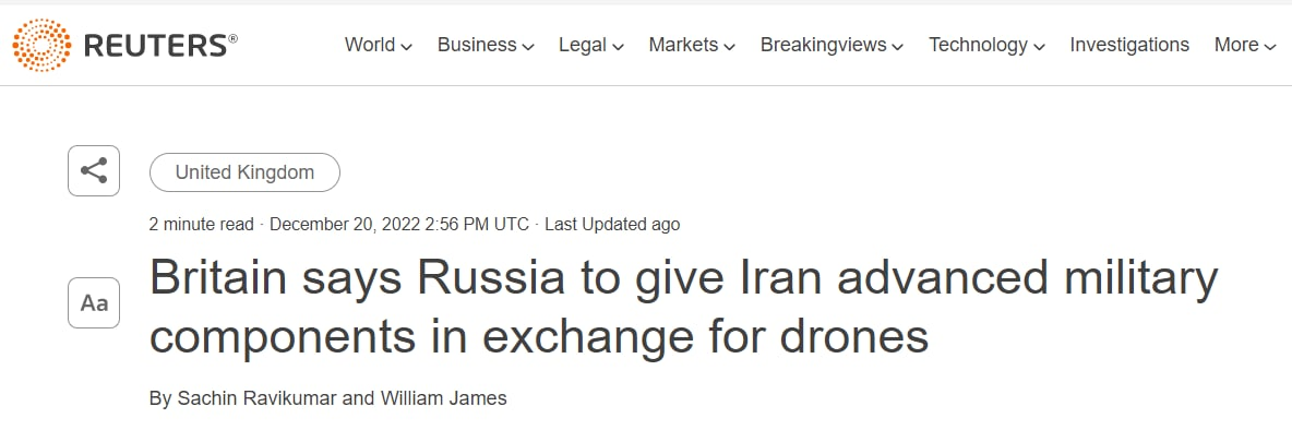 "В обмен на поставку более 300 беспилотников-камикадзе Россия теперь намерена предоставить Ирану передовые военные компоненты, подрывая как ближневосточную, так и международную безопасность", - отметил глава британского Минобороны.
