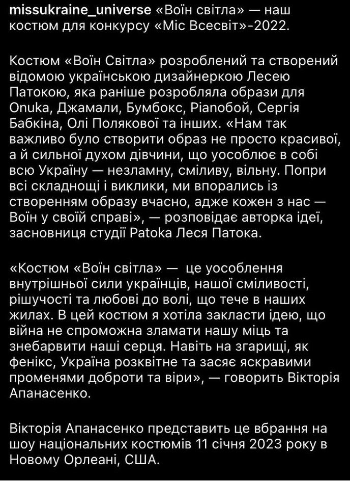 Представительница Украины выйдет на сцену "Мисс Вселенная-2022" в образе Архангела Михаила. Фото