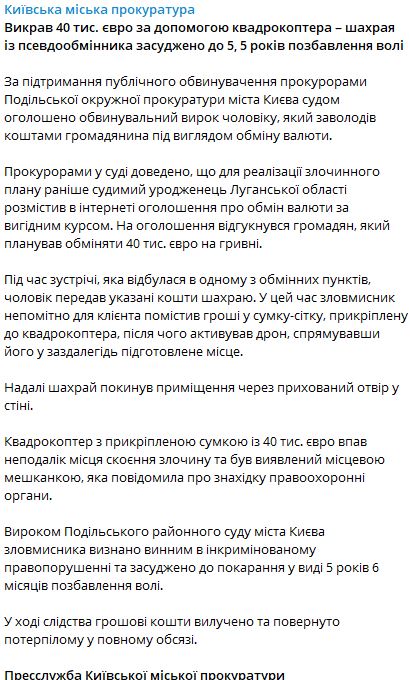 "Прокурорами в суде доказано, что для реализации преступного плана ранее судимый уроженец Луганской области разместил в интернете объявление об обмене валюты по выгодному курсу. На объявление откликнулся граждан, планировавший обменять 40 тыс. евро на гривне", - говорится в тексте.