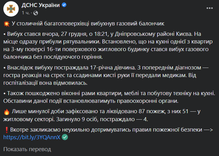 Инцидент произошел в 18:21 в Днепровском районе Киева. Спасатели установили, что на кухне одной из квартир на третьем этаже 16-этажного жилого дома взорвался газовый баллончик без последующего горения.