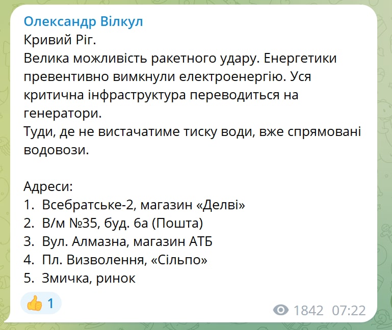 Напомним, в Украине масштабная тревога. Власти регионов предупреждают о возможных ударах и советуют запастись водой.