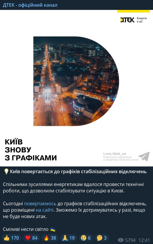 В ДТЭК сообщили, что энергетикам удалось стабилизировать ситуацию в энергосистеме столицы, так что если не будет новых атак, графики будут действовать и в Новый год.