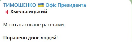 Также он сообщил, что в Хмельницке после сегодняшнего обстрела ранены как минимум четыре человека.