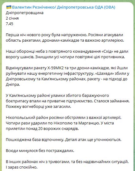 08.00 Ночью Днепропетровскую область россияне атаковали ракетами, дронами-камикадзе и тяжелой артиллерией.