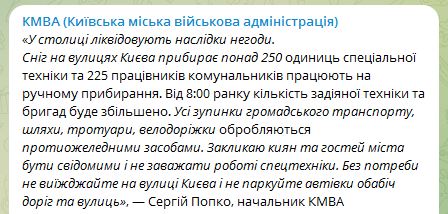 "Все остановки общественного транспорта, пути, тротуары, велодорожки обрабатываются противогололедными средствами. Призываю киевлян и гостей города быть сознательными и не мешать работе спецтехники. Без нужды не выезжайте на улицы Киева и не паркуйте автомобили по дорогам и улицам", — сообщил Сергей Попко, глава КГВА.
