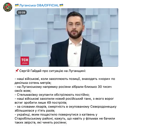Об этом сообщил глава Луганской ОВА Сергей Гайдай в эфире ТСН.
