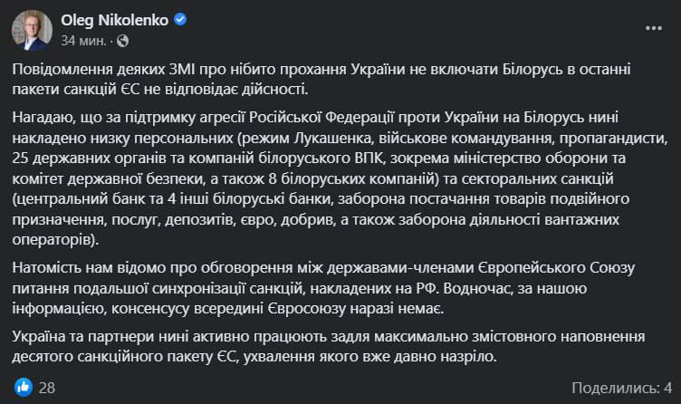 "Сообщения некоторых СМИ о якобы просьбе Украины не включать Беларусь в последние пакеты санкций не соответствует действительности", - сообщил спикер МИД Украины Олег Николенко.