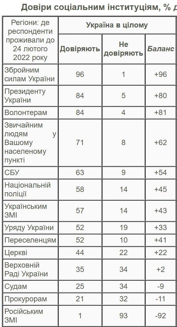 Больше всего доверяют украинцы ВСУ (96%), президенту и волонтерам (по 84%), обычным людям из своего города (71%), СБУ (63%), Нацполиции (58%).