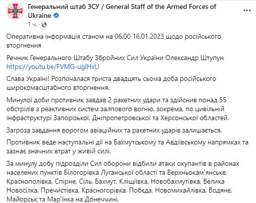Генштаб ВСУ обнародовал сводку о ситуации на фронте по состоянию на утро 16 января.