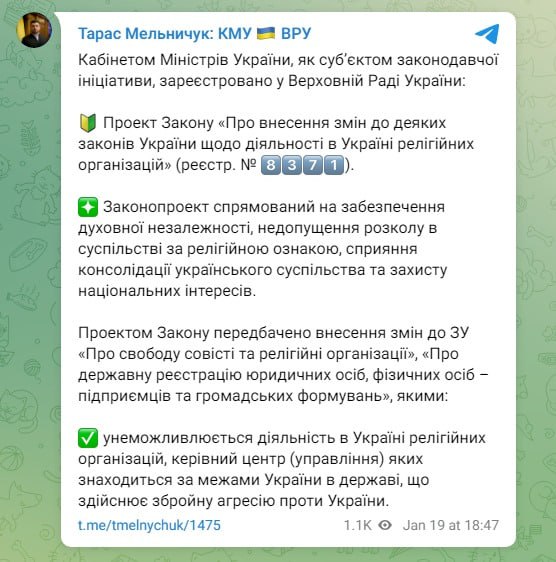 "Проектом закона предусмотрено внесение изменений в ЗУ "О свободе совести и религиозных организациях", "О государственной регистрации юридических лиц, физических лиц - предпринимателей и общественных формирований", которые делают невозможным деятельность в Украине религиозных организаций, руководящий центр (управление) которых находится за пределами Украины в государстве, которое совершает вооруженную агрессию против Украины", - написал депутат.
