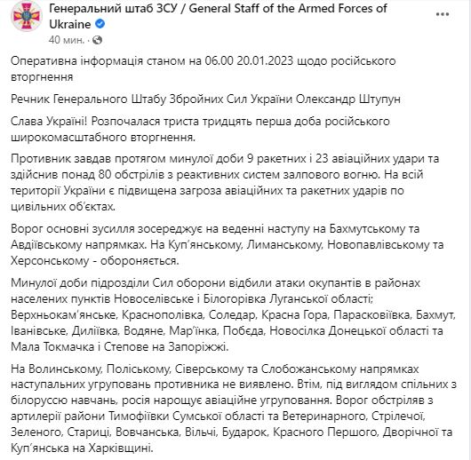 В пятницу, 20 января, в Украине идет уже 331-й день войны с РФ.