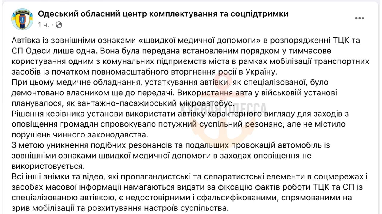 "Во избежание подобных резонансов и последующих провокаций автомобиль с внешними признаками скорой медицинской помощи в мероприятиях оповещения не используется. Все остальные снимки и видео, пропагандистские и сепаратистские элементы в соцсетях и средствах массовой информации, которые пытаются выдать за фиксацию фактов работы ТЦК и СП со специализированным автомобилем, недостоверны и сфальсифицированы, направлены на срыв мобилизации и расшатывание настроений общества", - говорятся в заявлении.