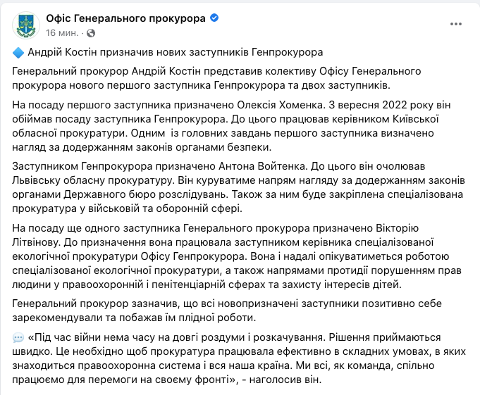 Масштабные кадровые ротации произошли в Офисе генпрокурора после увольнения замглавы ведомства Алексея Симоненко. Новыми заместителями генпрокурора Андрея Костина стали Антон Войтенко и Виктория Литвинова, а Алексей Хоменко повышен до первого заместителя.