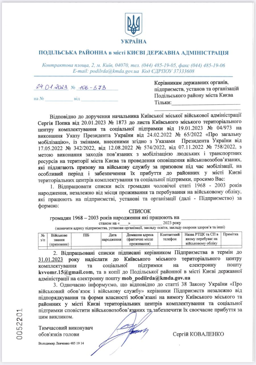В тылу тем временем продолжают закручивать гайки по мобилизации. Сегодня телеграм-каналы опубликовали фото обращения Подольской госадминистрации Киева. Она просит предприятия предоставить данные всех мобилизованных до 31 января.