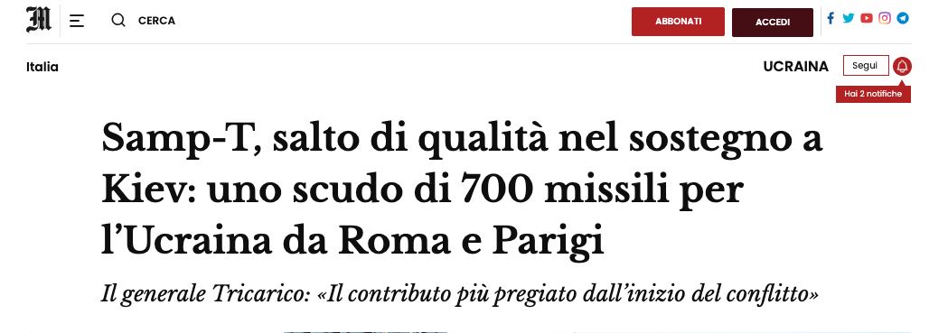 Тем временем издание Il Messaggero сообщает, что министры обороны Италии и Франции уже договорились закупить 700 зенитных ракет Aster-30 для этой системы и передать часть из них Украине.