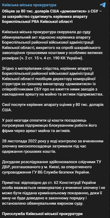В Киеве за мошенничество будут судить руководителя аппарата Бориспольского районной военной администрации Киевской области, который за 80 тыс. долларов обещал "договориться" с СБУ.
