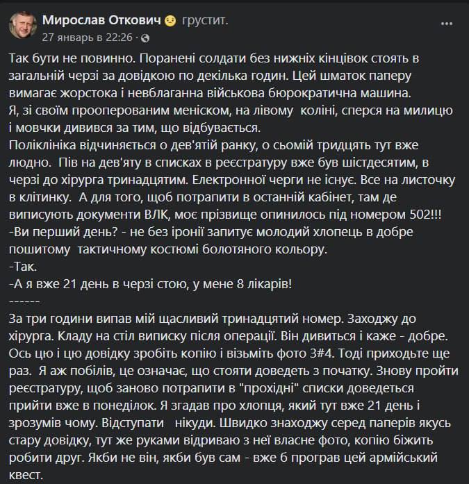 Военнослужащий Мирослав Откович рассказал в Facebook об ужасном состоянии дел во Львовской клинике амбулаторно-поликлинической помощи Минобороны Украины.