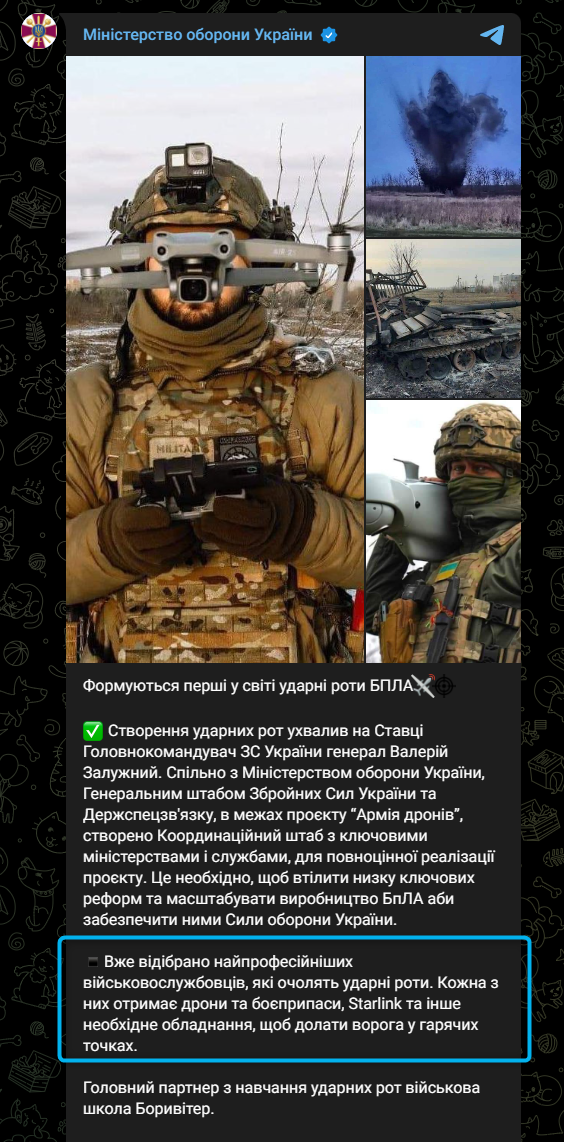 Интересно, что в конце января Минобороны Украины сообщало, что в Украине формируются ударные роты беспилотных летательных аппаратов. Как заявлялось, они будут оснащены терминалами Starlink.