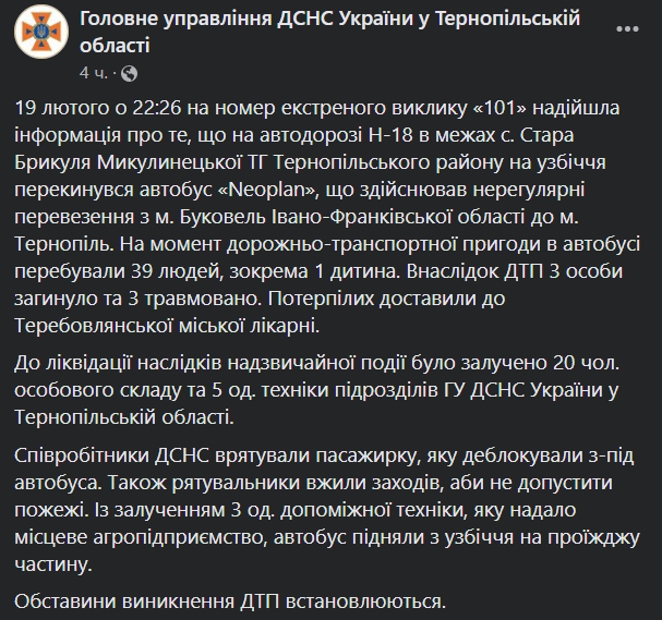 В момент аварии в автобусе находились 39 человек, среди которых один ребенок. В результате ДТП погибли три человека, еще трое получили ранения. Травмированных доставили в Теребовлянскую городскую больницу.