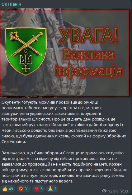 "Об этом свидетельствуют данные разведки, где зафиксировано движение колонн военной техники в районе границы с Черниговской областью без знаков распознавания и живой силой, одетой в пиксель, похож на форму Вооруженных Сил Украины", - говорится в сообщении.