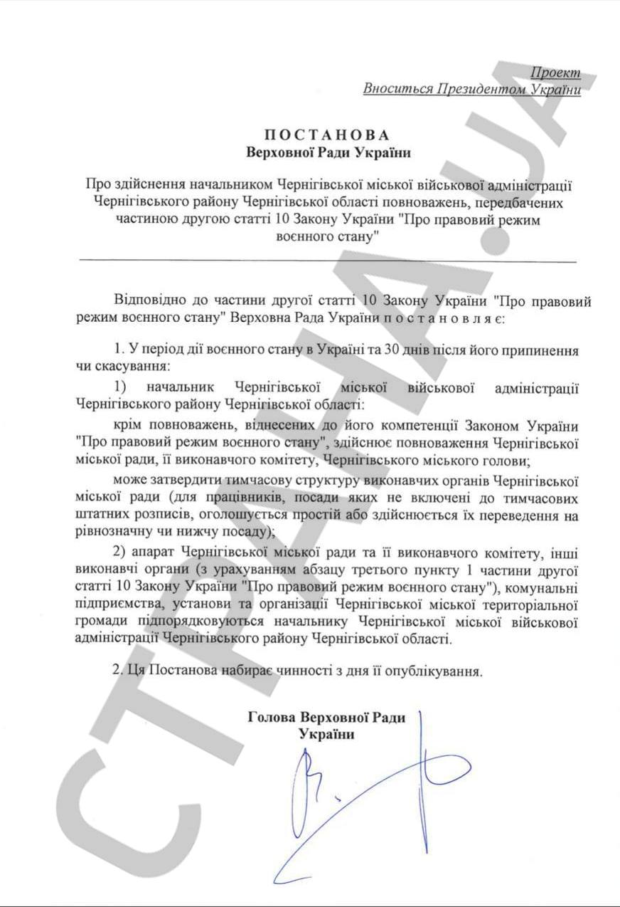 10:22 В распоряжении «Страны» оказался проект постановления, предоставляющий новоназначенному главе военной администрации Чернигова широкий перечень полномочий, который позволит ему полностью взять на себя полномочия избранных органов местного самоуправления города.
