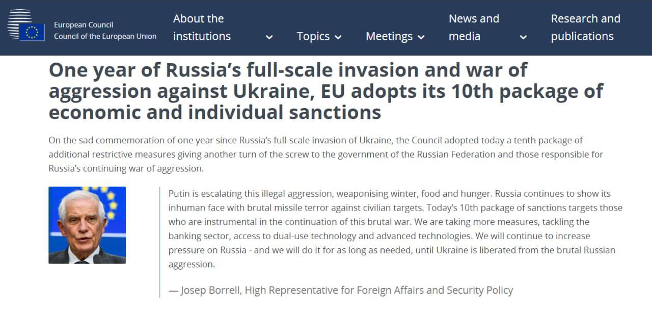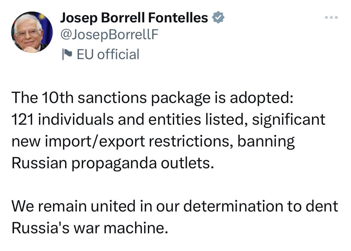 ЕС принял десятый пакет санкций против России, в черные списки занесен 121 человек.