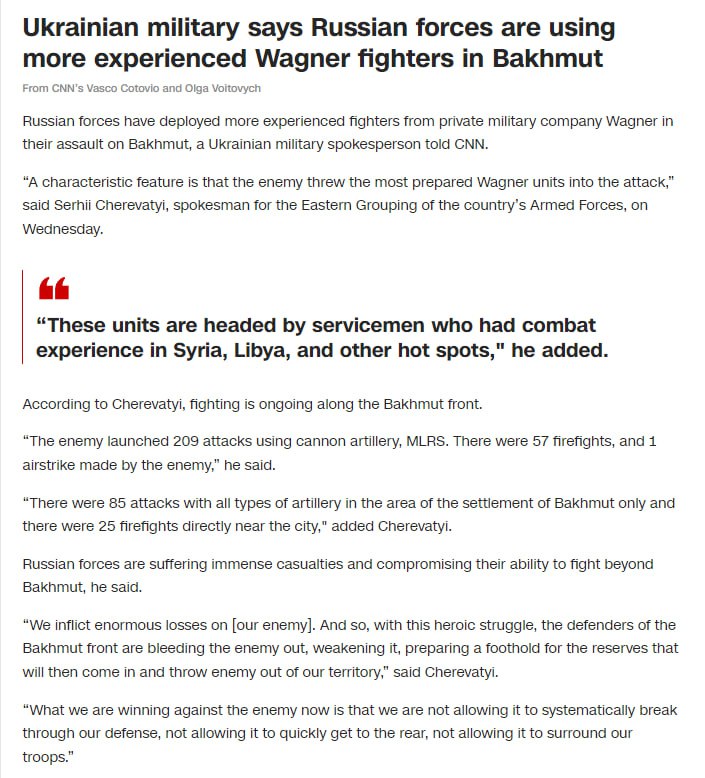 По словам Череватого, РФ использует в Бахмуте опытных "вагнеровцев" с опытом боев в Сирии, Ливии, и других горячих точках, но ВСУ держат позиции, не давая противнику окружить город.