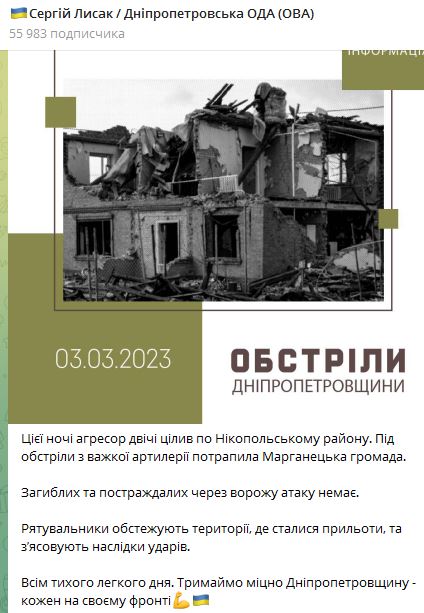 Ночью 3 марта войска РФ дважды обстреляли Никопольский район Днепропетровской области.
