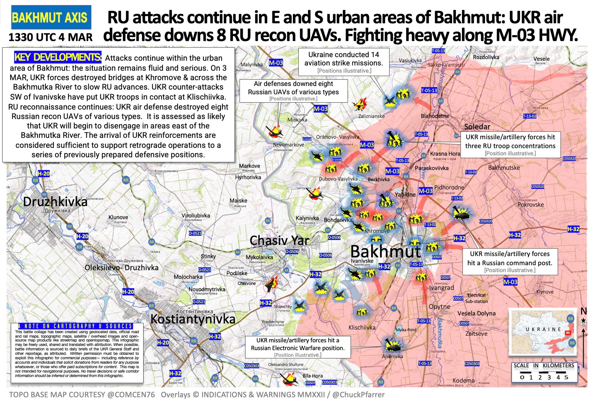 В то же время телеканал CNN вчера заявлял, что это делает Украина, чтобы замедлить российскую армию. Сегодня аналогичное предположение выдвинул военный обозреватель Чак Пфаррер. По его мнению, украинские силы уничтожили мосты в Хромовом (к западу от города) и через реку Бахмутка (на востоке города), чтобы замедлить продвижение России.