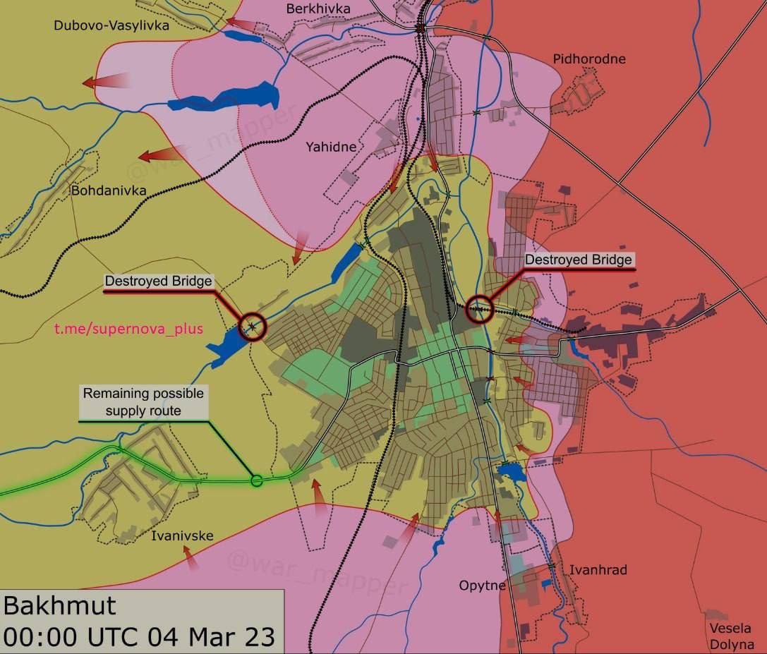 "Упреждающее разрушение мостов, вероятно, указывает на то, что украинские войска могут попытаться воспрепятствовать передвижению русских в восточной части Бахмута и ограничить потенциальные пути выхода русских из Бахмута на запад", - говорится в отчете.