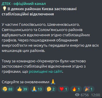 12.04 В некоторых районах Киева применяются стабилизационные отключения, сообщают в ДТЭК.