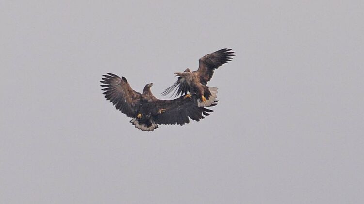 На градирне удалось сфотографировать редкую сову – филина обыкновенного. Также зафиксировали 11 орланов: некоторые сидели на льду, кто-то играл в воздухе. У тех орланов, которые строили гнездо в ноябре 2022 года, уже есть яйца. Самка сидит на гнезде. Заметили и молодого беркута, кружившегося вдали. Хорошо мигрируют жаворонки полевые.