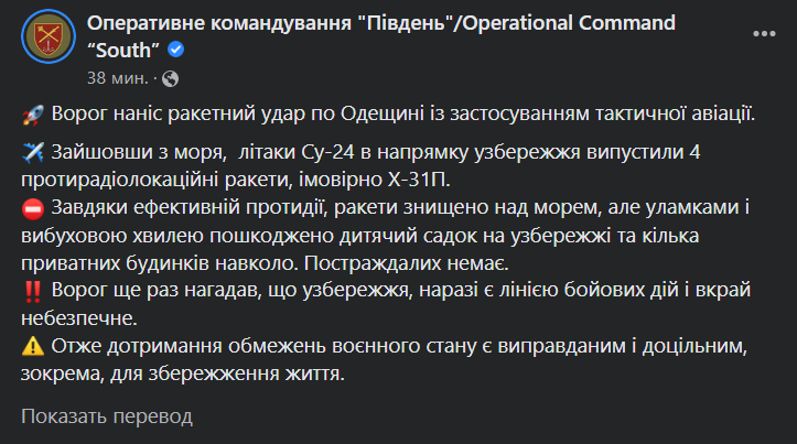 В ходе утренней воздушной тревоги Россия нанесла ракетный удар по Одесской области с применением тактической авиации.