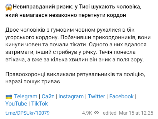"Двое мужчин с резиновой лодкой двигались в сторону венгерской границы. Увидев пограничников, они бросили лодку и начали убегать. Одного из них удалось задержать, другой прыгнул в реку. Течение понесло беглеца, а уже через несколько минут он исчез из виду", - пишет пресс-служба ГПСУ.