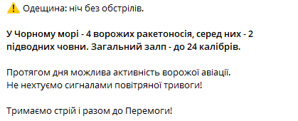 Согласно данным пресс-секретаря областной военной администрации, враг может атаковать Украину 24 "Калибрами".