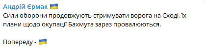 "Силы оборони продолжают сдерживать врага на Востоке, их планы по оккупации Бахмута сейчас проваливаются".
