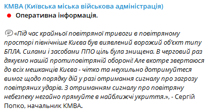 Во время крайней воздушной тревоги днем 20 марта в воздушном пространстве севернее Киева был обнаружен враждебный объект типа БПЛА. Силами и средствами ПВО цель была уничтожена.