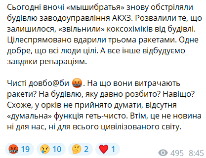 "Целенаправленно ударили тремя ракетами. На что они тратят ракеты? На здание, которое давно разбито? Зачем?", - написал нардеп и опубликовал новые видео с места прилетов.