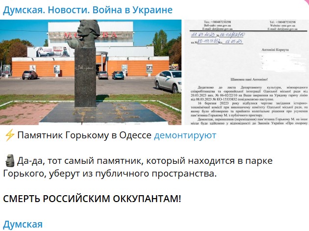 На днях в Одессе горсовет принял решение о демонтаже мемориальной доски писателю Максиму Горькому, сообщил проект "Деколонизация Украина".