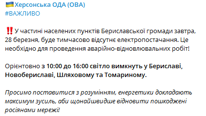 "Ориентировочно с 10:00 до 16:00 свет выключат в Бериславе, Новобериславе, Шляховом и Томарином. Просим отнестись с пониманием, энергетики прилагают максимум усилий, чтобы как можно быстрее восстановить поврежденные россиянами сети", - отмечают в ОВА.