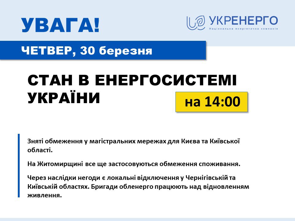 Напомним, министр энергетики Украины Герман Галущенко заявил, 30 марта энергосистема страны работает без ограничений потребителей, однако в некоторых населенных пунктах Одесской и Черниговской областей еще возможны непродолжительные отключения.