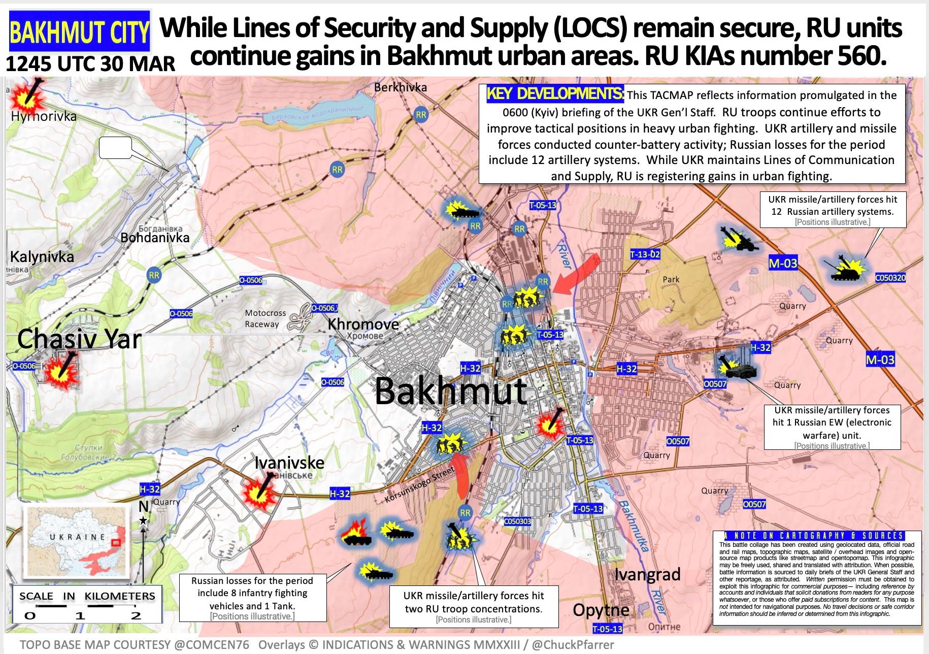 По оценкам американского Института изучения войны, российские войска продвигались в южном и юго-западном Бахмуте. Западные военные блогеры пишут, что "вагнеровцы" закрепились в северных частях Бахмута.