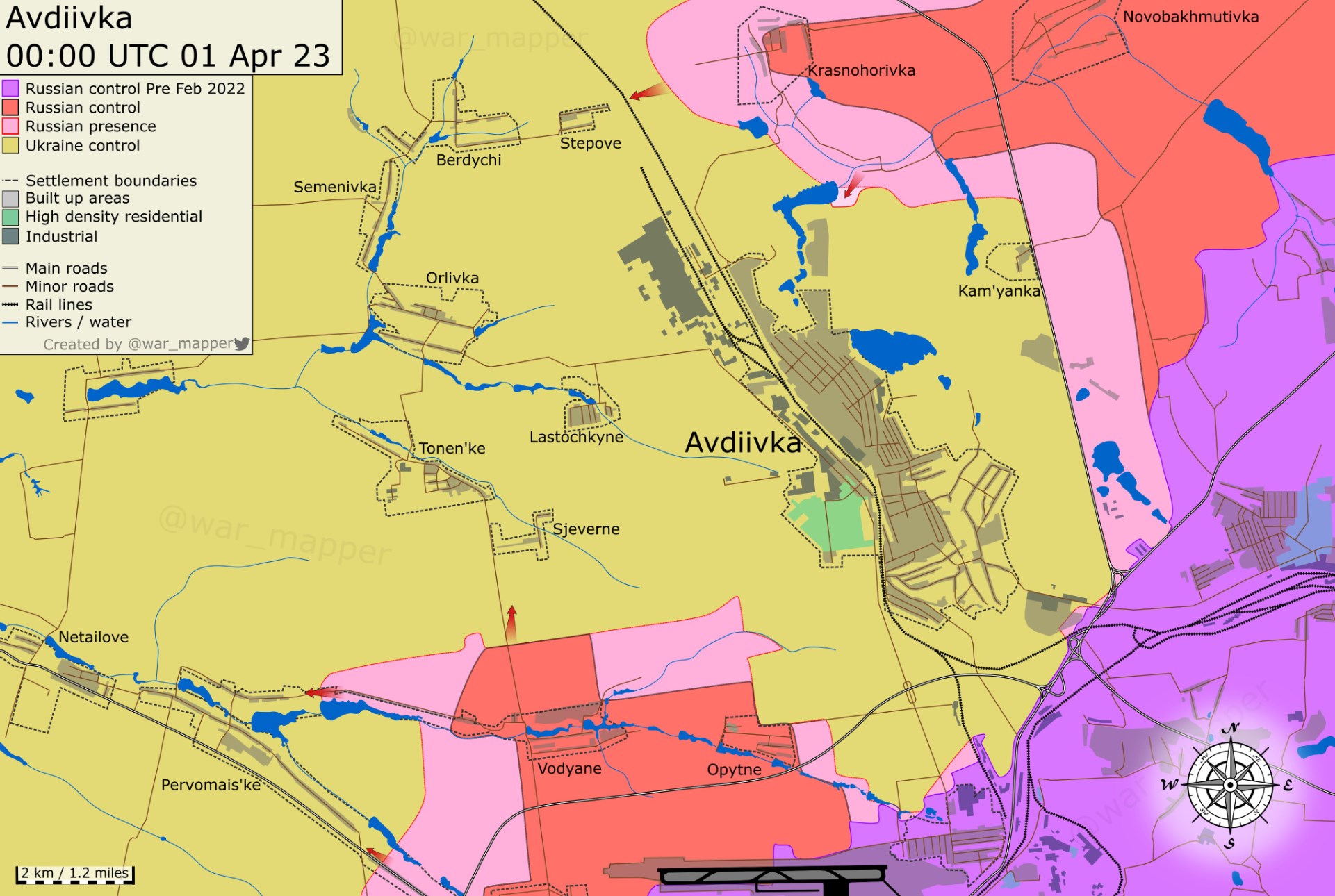 "Институт изучения войны", анализируя видео с фронта, сообщает, что российские войска продвинулись в окрестностях Веселого (шесть километров к северу от Авдеевки).