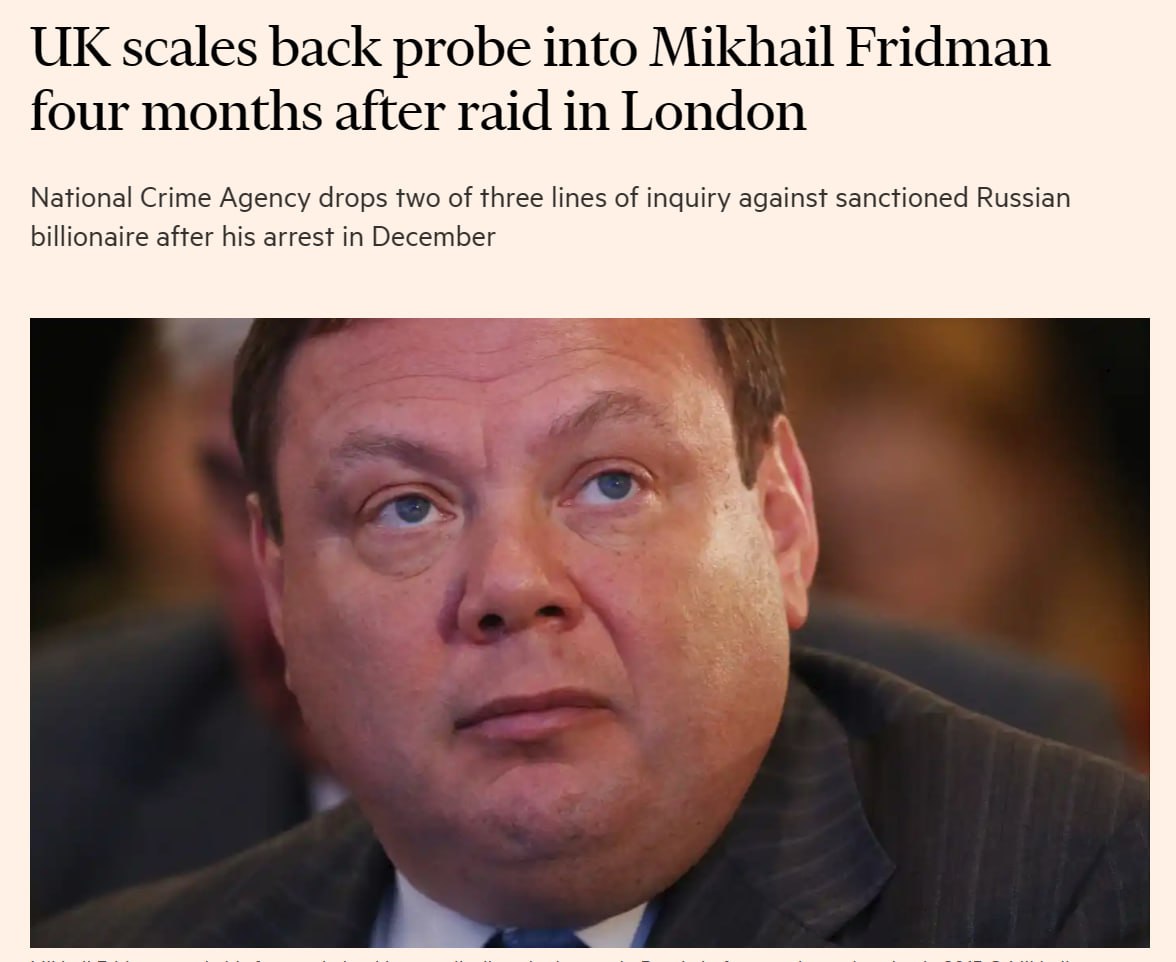 Газета считает снятие части подозрений "неудачей нового подразделения агентства по борьбе с клептократией". Оно было создано после вторжения России в Украину "для борьбы с коррумпированными элитами и связанными с Кремлем людьми, отмывающими свои активы в Великобритании".