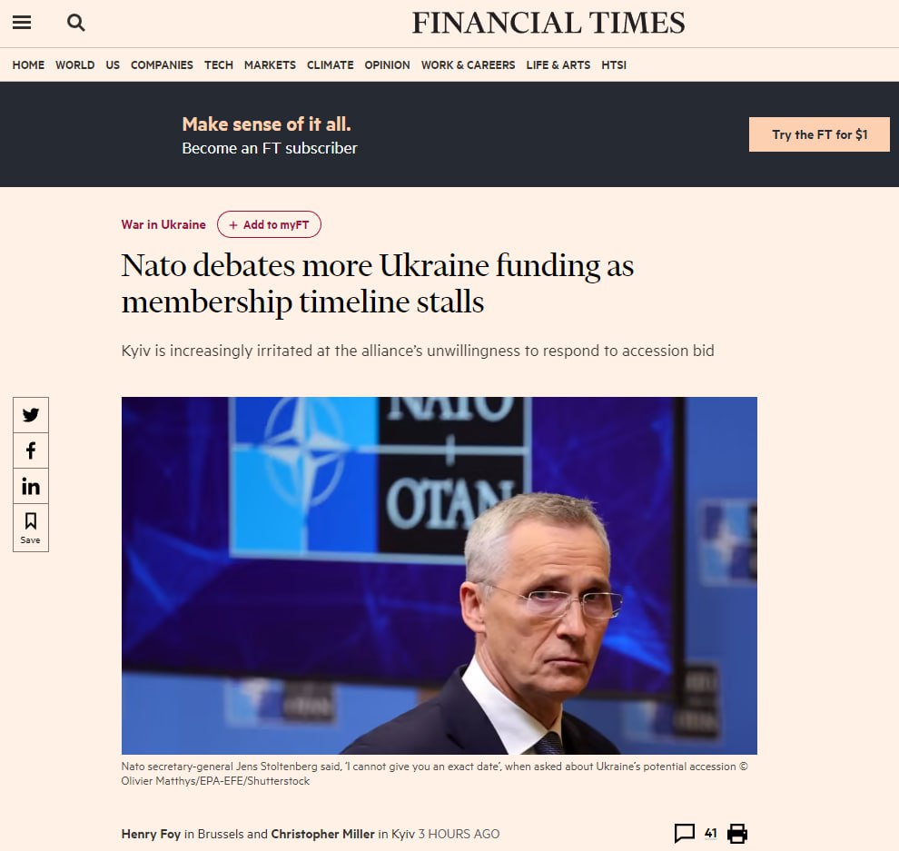 10:23 НАТО не сможет предложить Украине членство в ближайшее время, пишет Financial Times.